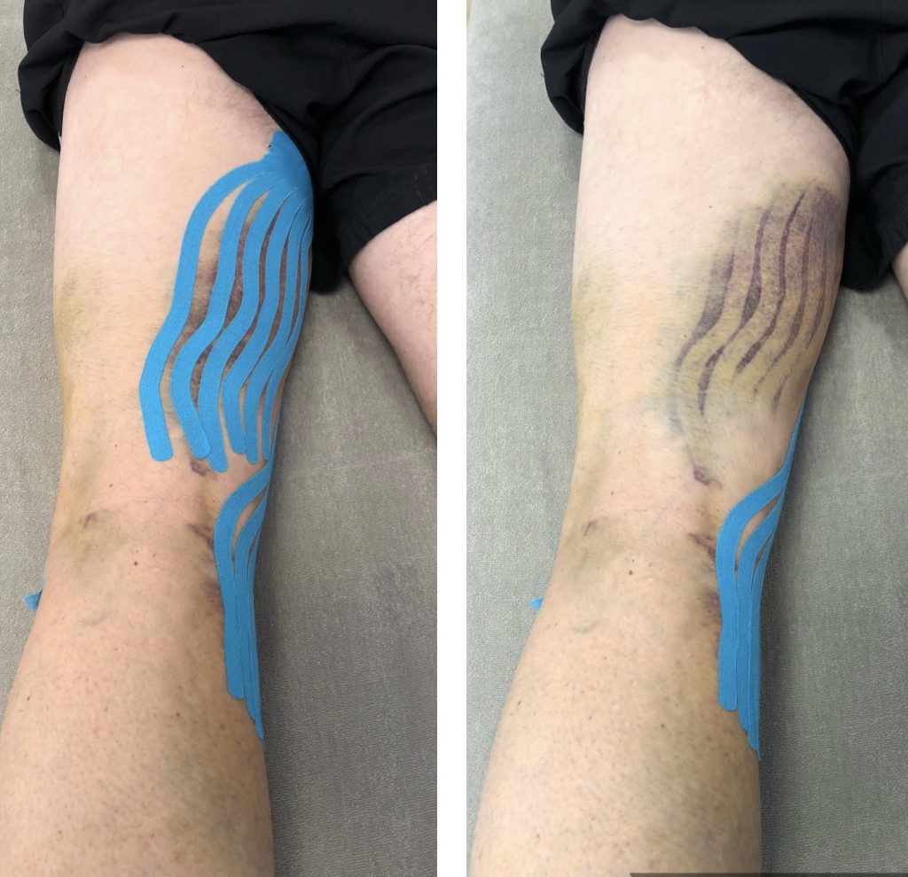 Funktionelle Klebeverbände die den Körper unterstützen sollen. Wir unterscheiden zwischen elastischem Kinesiotape (siehe Bild) und festem Sporttape.